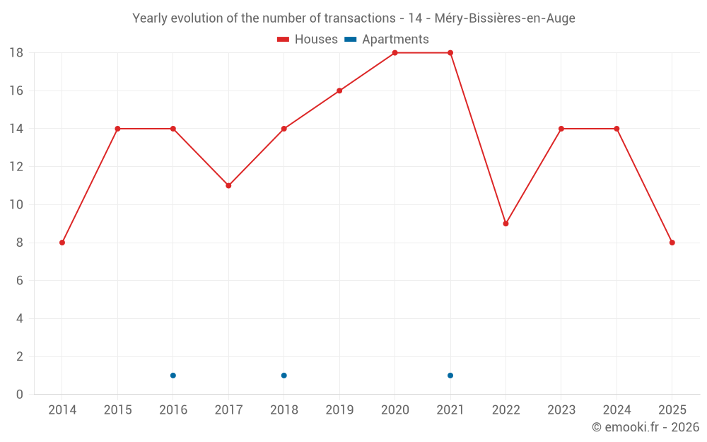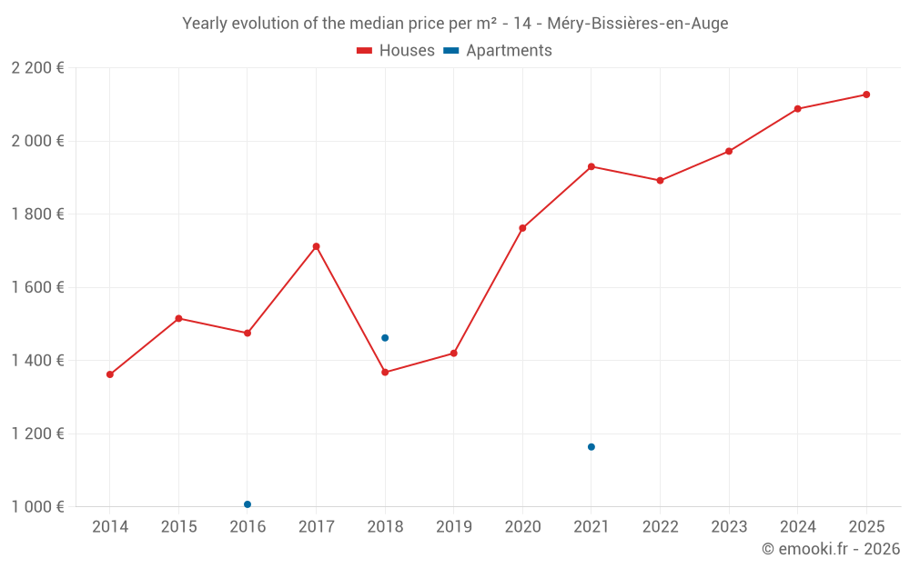 The median price on the 27 house transactions of the last 24 months in the municipality of Méry-Bissières-en-Auge was 2 076 € per square meter for a median property value of 217 000 €. Over this period, 60% of transactions were between 1 605 and 2 330 € per square meter (from the 2nd to the 8th deciles).
