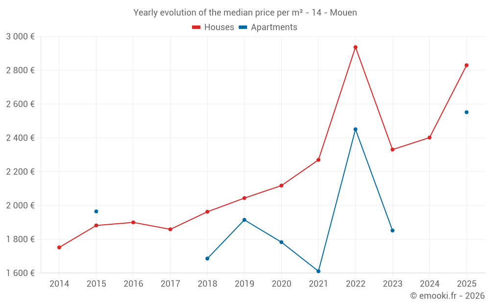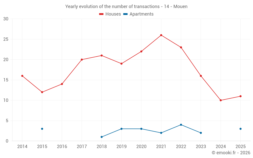 The median price on the 17 house transactions of the last 12 months in the municipality of Mouen was 2 489 € per square meter for a median property value of 240 550 €. Over this period, 60% of transactions were between 2 083 and 3 034 € per square meter (from the 2nd to the 8th deciles).