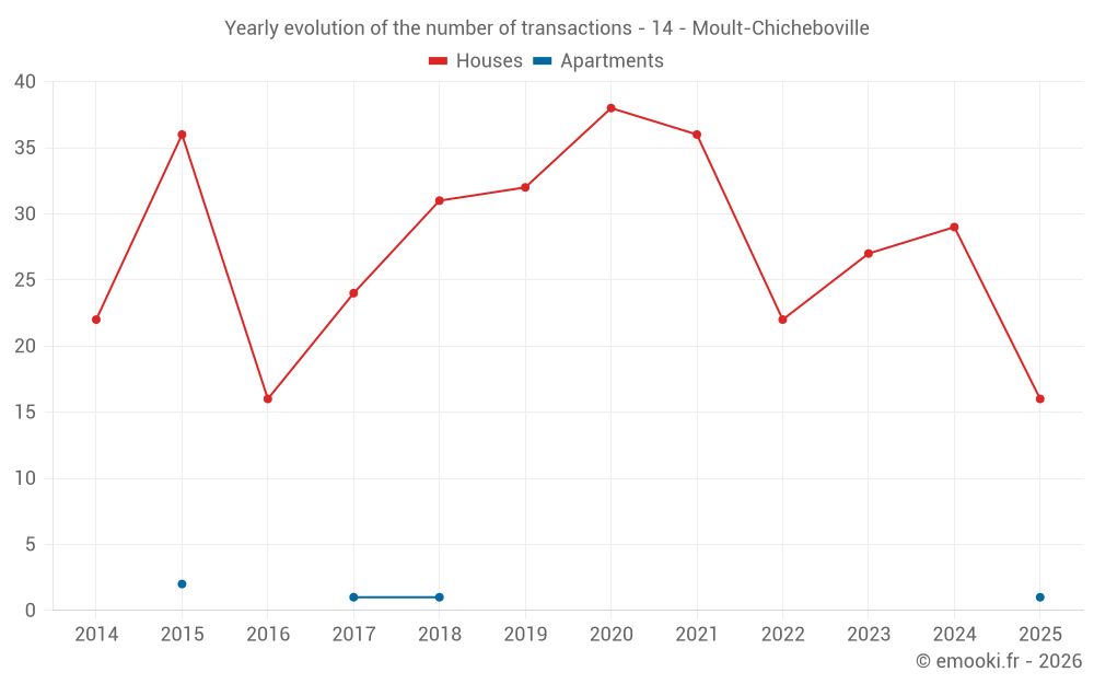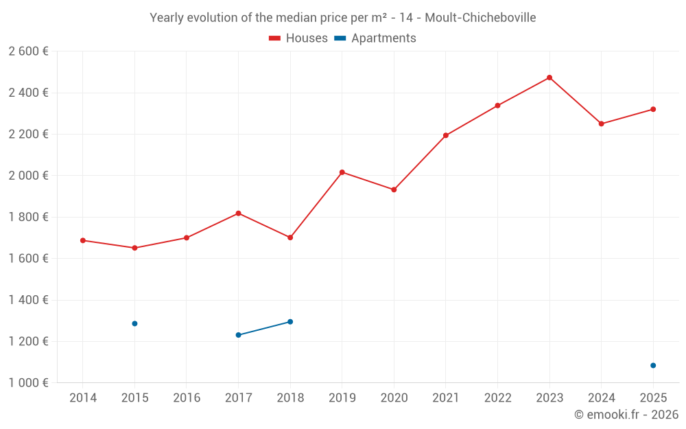 The median price on the 30 house transactions of the last 12 months in the municipality of Moult-Chicheboville was 2 269 € per square meter for a median property value of 236 500 €. Over this period, 60% of transactions were between 1 809 and 2 725 € per square meter (from the 2nd to the 8th deciles).