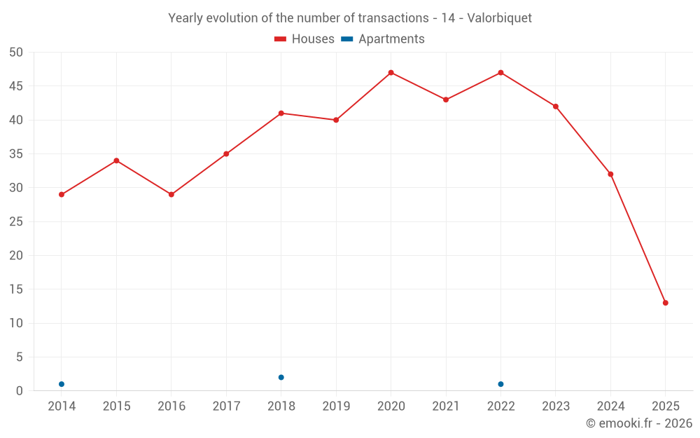 The median price on the 27 house transactions of the last 12 months in the municipality of Valorbiquet was 1 940 € per square meter for a median property value of 180 456 €. Over this period, 60% of transactions were between 1 332 and 2 346 € per square meter (from the 2nd to the 8th deciles).