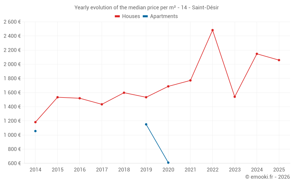 The median price on the 22 house transactions of the last 12 months in the municipality of Saint-Désir was 2 084 € per square meter for a median property value of 198 635 €. Over this period, 60% of transactions were between 1 715 and 2 590 € per square meter (from the 2nd to the 8th deciles).