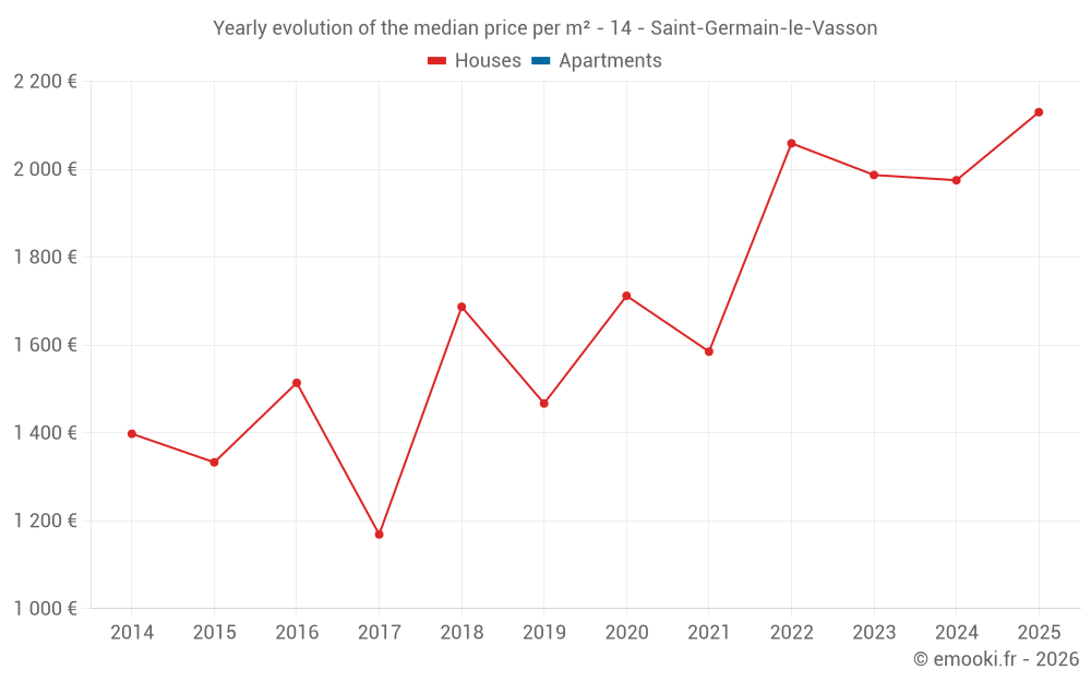 The median price on the 24 house transactions of the last 24 months in the municipality of Saint-Germain-le-Vasson was 1 892 € per square meter for a median property value of 199 750 €. Over this period, 60% of transactions were between 1 693 and 2 386 € per square meter (from the 2nd to the 8th deciles).