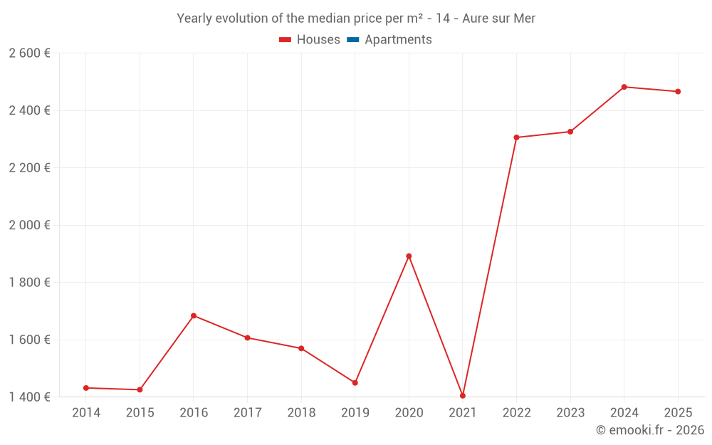 The median price on the 17 house transactions of the last 24 months in the municipality of Aure sur Mer was 2 314 € per square meter for a median property value of 236 050 €. Over this period, 60% of transactions were between 1 432 and 2 735 € per square meter (from the 2nd to the 8th deciles).