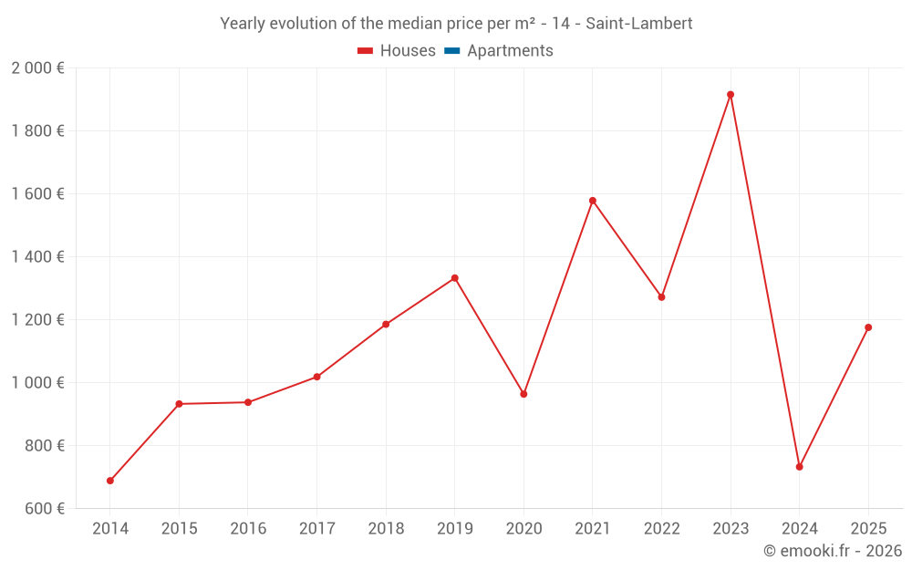 The median price on the 14 house transactions of the last 24 months in the municipality of Saint-Lambert was 1 020 € per square meter for a median property value of 93 905 €. Over this period, 60% of transactions were between 491 and 1 864 € per square meter (from the 2nd to the 8th deciles).