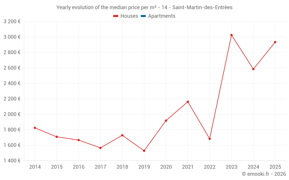 The median price on the 14 house transactions of the last 24 months in the municipality of Saint-Martin-des-Entrées was 2 872 € per square meter for a median property value of 359 500 €. Over this period, 60% of transactions were between 2 127 and 3 283 € per square meter (from the 2nd to the 8th deciles).