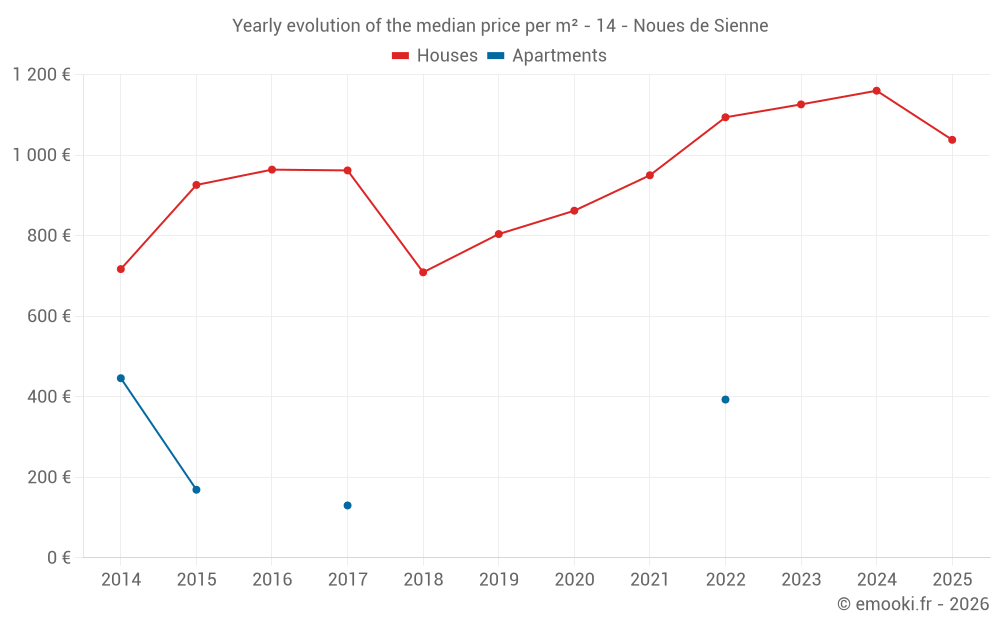 The median price on the 29 house transactions of the last 6 months in the municipality of Noues de Sienne was 1 038 € per square meter for a median property value of 109 500 €. Over this period, 60% of transactions were between 698 and 1 303 € per square meter (from the 2nd to the 8th deciles).