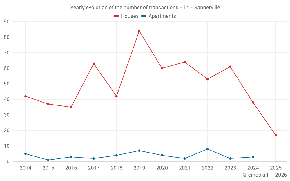 The median price on the 46 house transactions of the last 12 months in the municipality of Sannerville was 2 374 € per square meter for a median property value of 220 000 €. Over this period, 60% of transactions were between 1 957 and 2 782 € per square meter (from the 2nd to the 8th deciles).