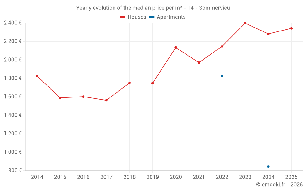 The median price on the 22 house transactions of the last 24 months in the municipality of Sommervieu was 2 330 € per square meter for a median property value of 240 190 €. Over this period, 60% of transactions were between 1 762 and 2 809 € per square meter (from the 2nd to the 8th deciles).