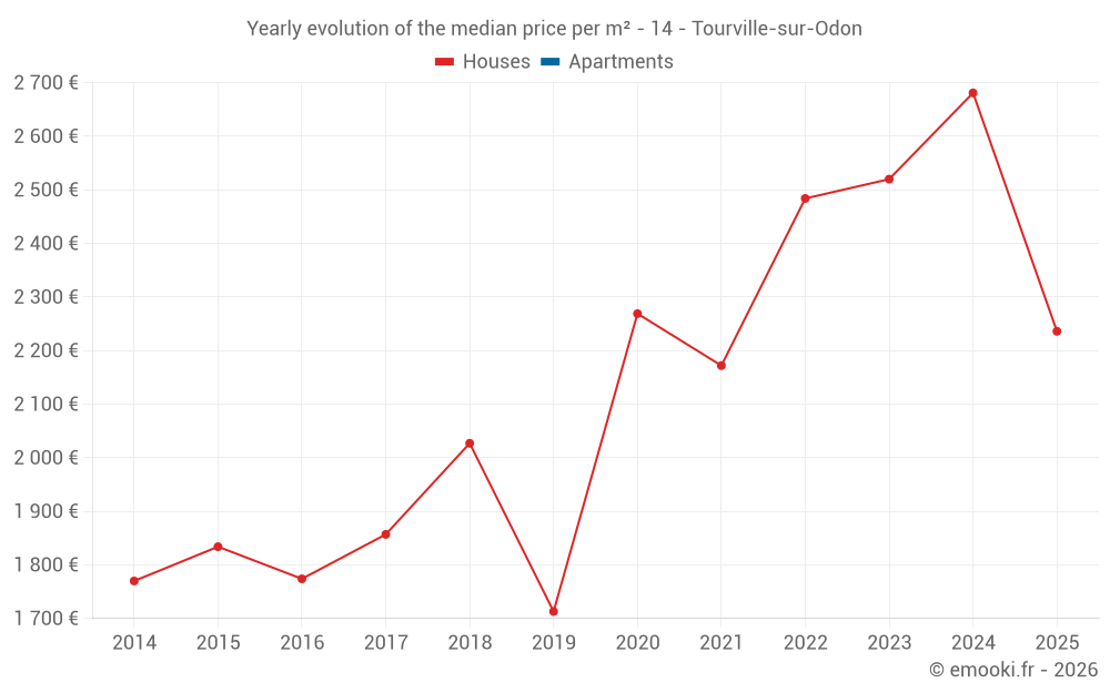 The median price on the 18 house transactions of the last 24 months in the municipality of Tourville-sur-Odon was 2 493 € per square meter for a median property value of 248 000 €. Over this period, 60% of transactions were between 1 938 and 2 806 € per square meter (from the 2nd to the 8th deciles).