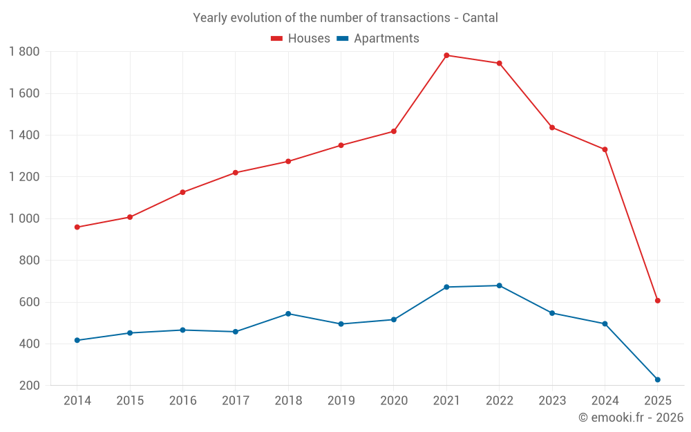 The median price on the 294 house transactions of the last 3 months in the Cantal department was 1 214 € per square meter for a median property value of 110 500 €. Over this period, 60% of transactions were between 641 and 1 903 € per square meter (from the 2nd to the 8th deciles).