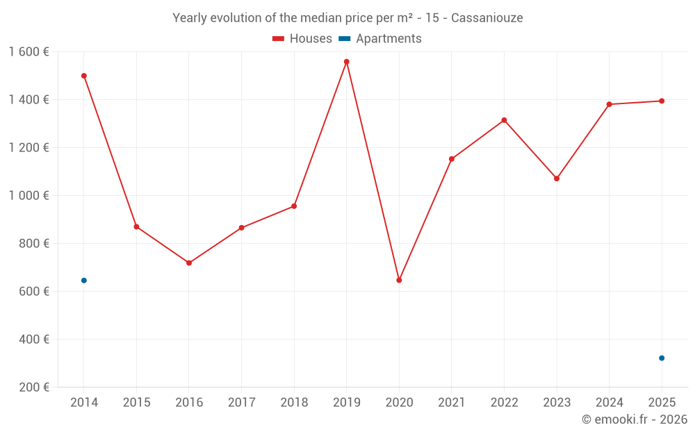 The median price on the 19 house transactions of the last 24 months in the municipality of Cassaniouze was 1 192 € per square meter for a median property value of 137 800 €. Over this period, 60% of transactions were between 452 and 2 011 € per square meter (from the 2nd to the 8th deciles).