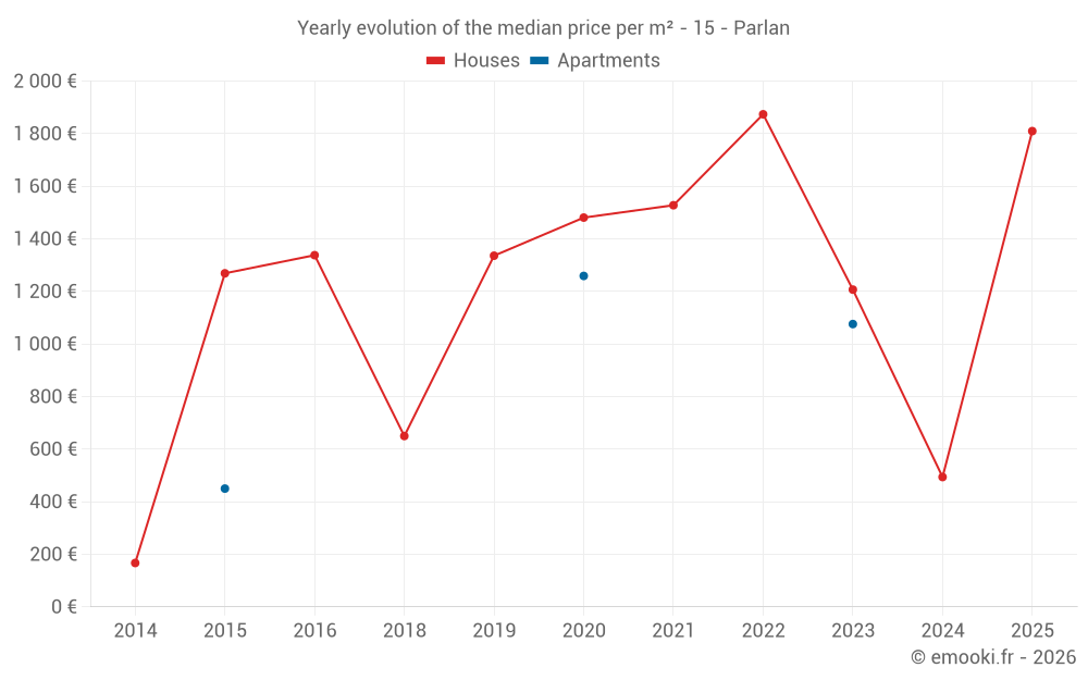 The median price on the 15 house transactions of the last 24 months in the municipality of Parlan was 1 286 € per square meter for a median property value of 111 879 €. Over this period, 60% of transactions were between 439 and 1 841 € per square meter (from the 2nd to the 8th deciles).