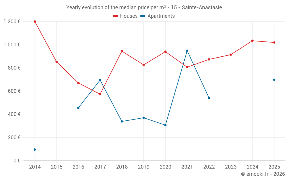 The median price on the 36 house transactions of the last 24 months in the municipality of Sainte-Anastasie was 1 026 € per square meter for a median property value of 95 625 €. Over this period, 60% of transactions were between 667 and 1 723 € per square meter (from the 2nd to the 8th deciles).
