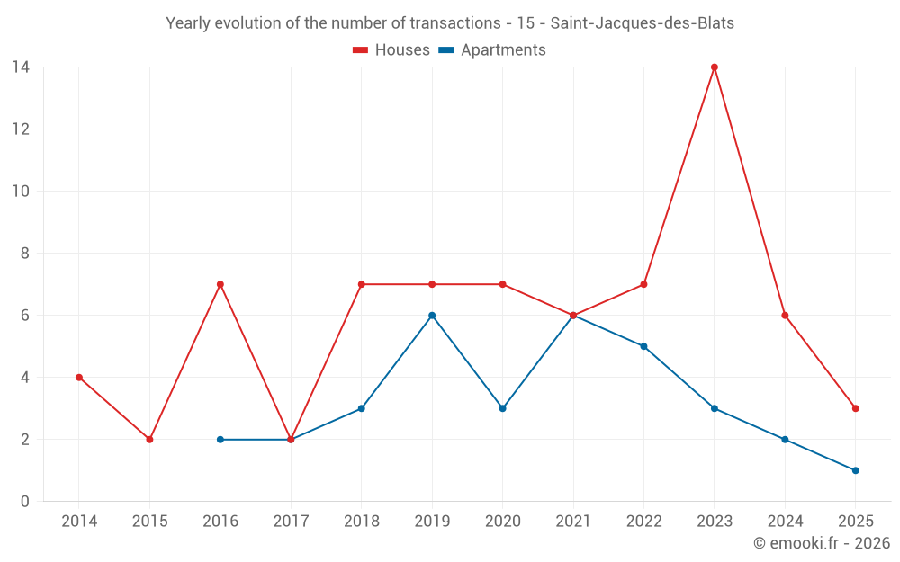 The median price on the 15 house transactions of the last 24 months in the municipality of Saint-Jacques-des-Blats was 1 729 € per square meter for a median property value of 140 700 €. Over this period, 60% of transactions were between 1 283 and 2 253 € per square meter (from the 2nd to the 8th deciles).