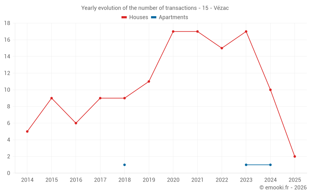 The median price on the 18 house transactions of the last 24 months in the municipality of Vézac was 2 094 € per square meter for a median property value of 167 505 €. Over this period, 60% of transactions were between 1 553 and 2 333 € per square meter (from the 2nd to the 8th deciles).