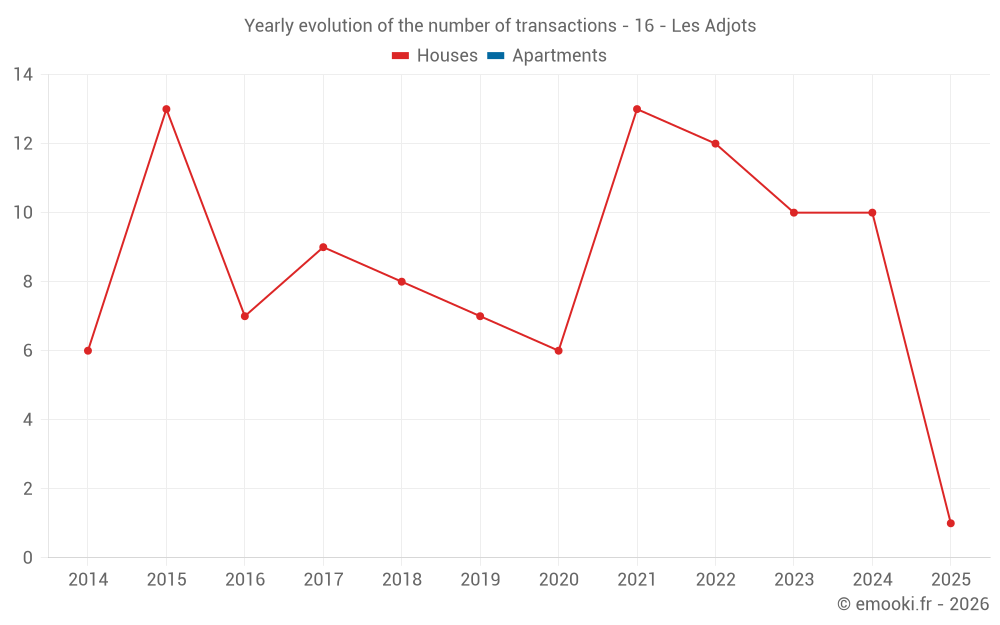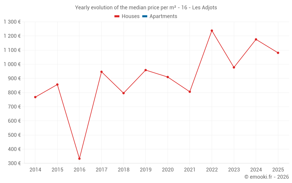 The median price on the 16 house transactions of the last 24 months in the municipality of Les Adjots was 1 112 € per square meter for a median property value of 78 000 €. Over this period, 60% of transactions were between 578 and 1 250 € per square meter (from the 2nd to the 8th deciles).