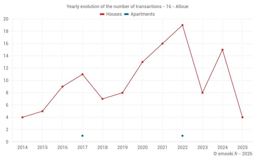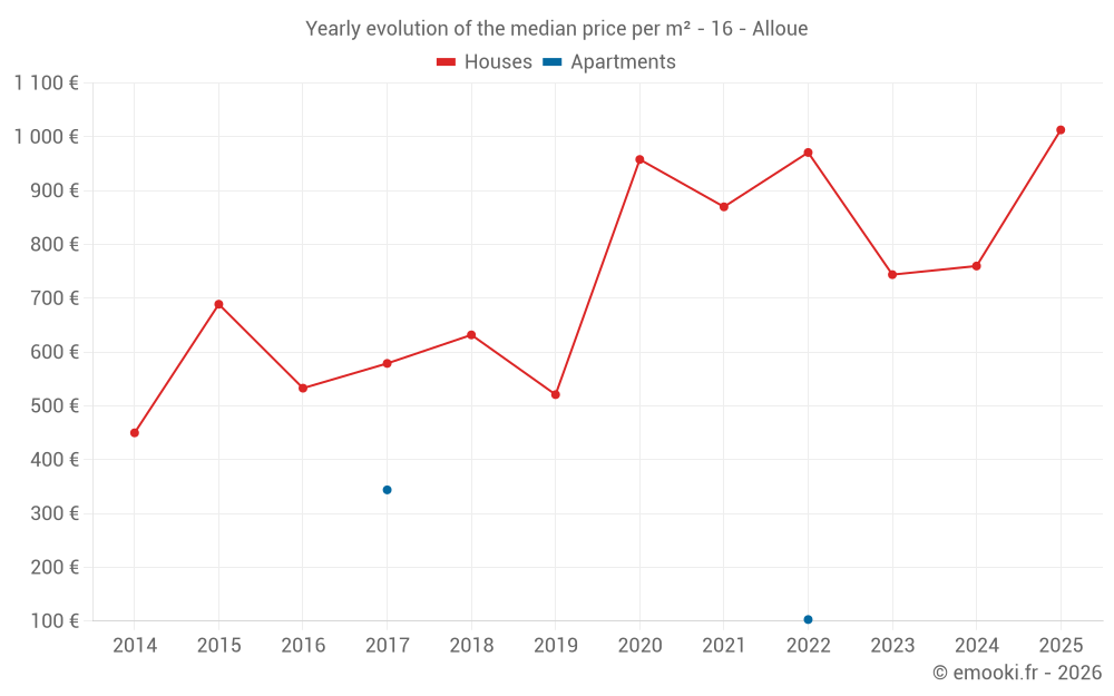 The median price on the 16 house transactions of the last 12 months in the municipality of Alloue was 857 € per square meter for a median property value of 88 500 €. Over this period, 60% of transactions were between 521 and 1 089 € per square meter (from the 2nd to the 8th deciles).
