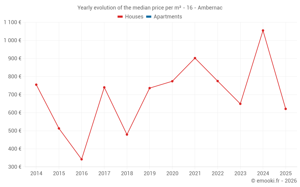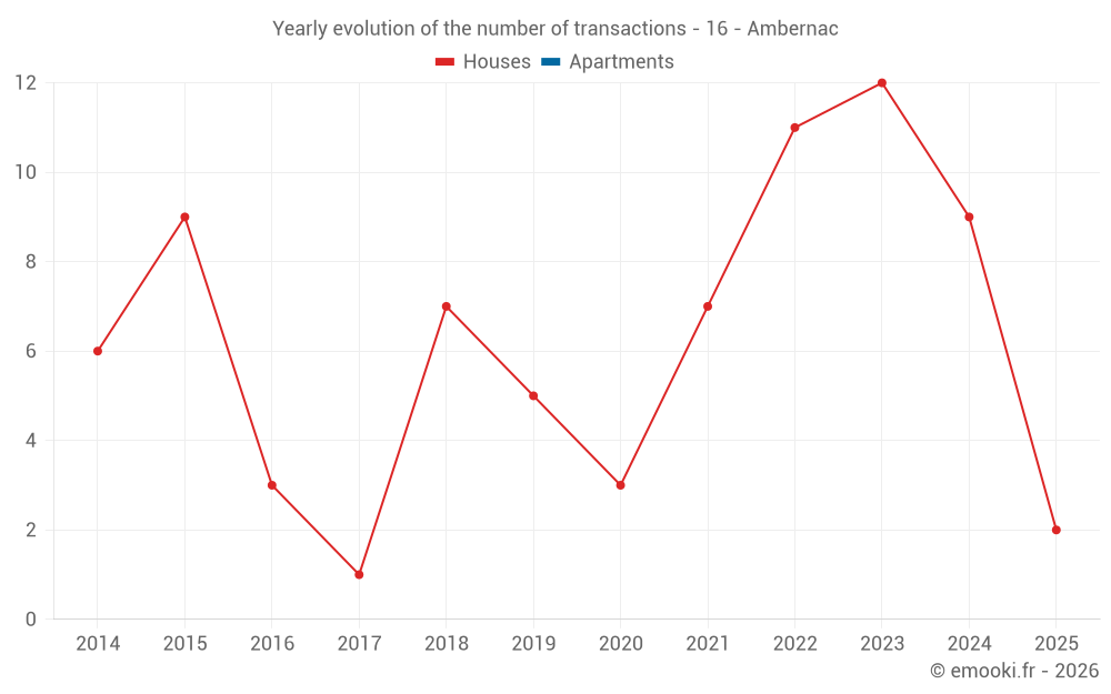 The median price on the 17 house transactions of the last 24 months in the municipality of Ambernac was 645 € per square meter for a median property value of 50 054 €. Over this period, 60% of transactions were between 431 and 1 440 € per square meter (from the 2nd to the 8th deciles).