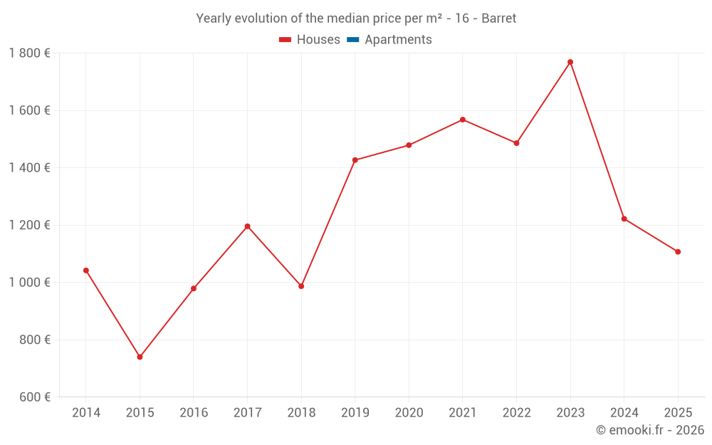 The median price on the 17 house transactions of the last 24 months in the municipality of Barret was 1 169 € per square meter for a median property value of 135 000 €. Over this period, 60% of transactions were between 703 and 1 694 € per square meter (from the 2nd to the 8th deciles).