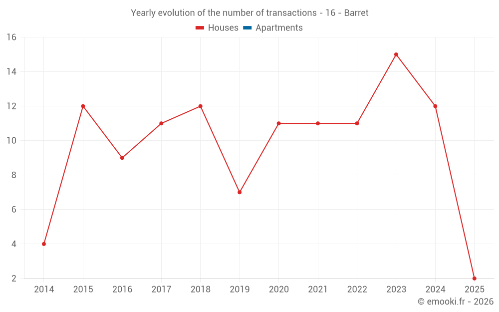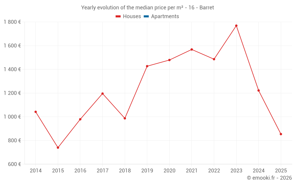 The median price on the 22 house transactions of the last 24 months in the municipality of Barret was 1 424 € per square meter for a median property value of 188 000 €. Over this period, 60% of transactions were between 745 and 1 918 € per square meter (from the 2nd to the 8th deciles).