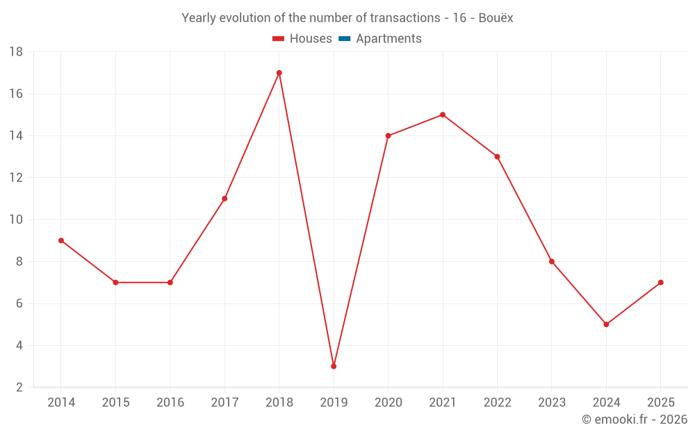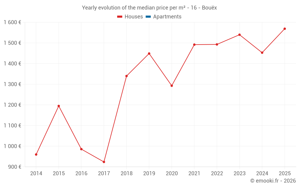 The median price on the 16 house transactions of the last 24 months in the municipality of Bouëx was 1 511 € per square meter for a median property value of 157 000 €. Over this period, 60% of transactions were between 1 054 and 1 863 € per square meter (from the 2nd to the 8th deciles).