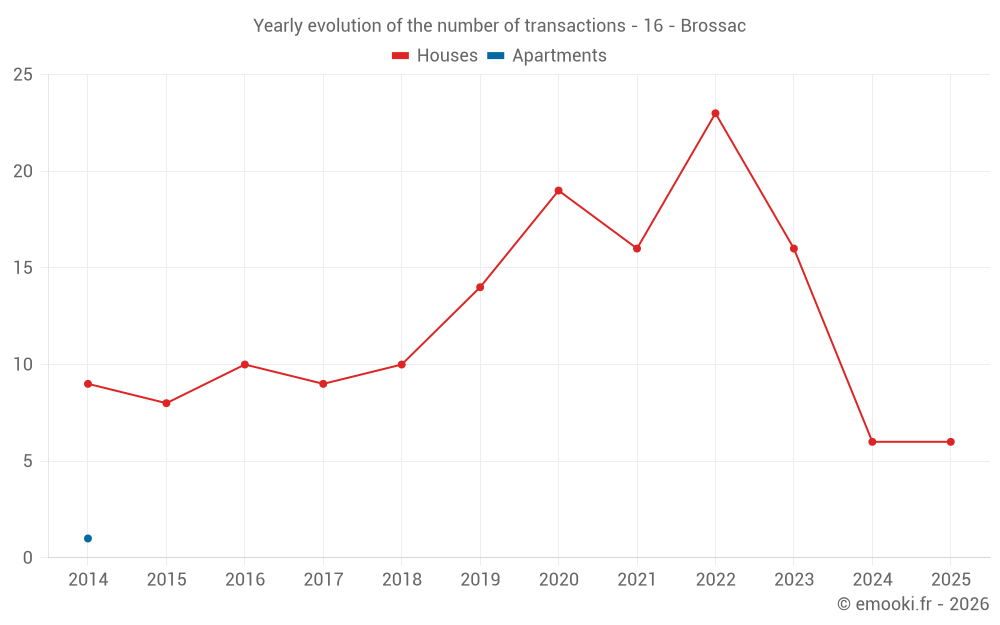 The median price on the 19 house transactions of the last 24 months in the municipality of Brossac was 907 € per square meter for a median property value of 90 000 €. Over this period, 60% of transactions were between 523 and 1 621 € per square meter (from the 2nd to the 8th deciles).