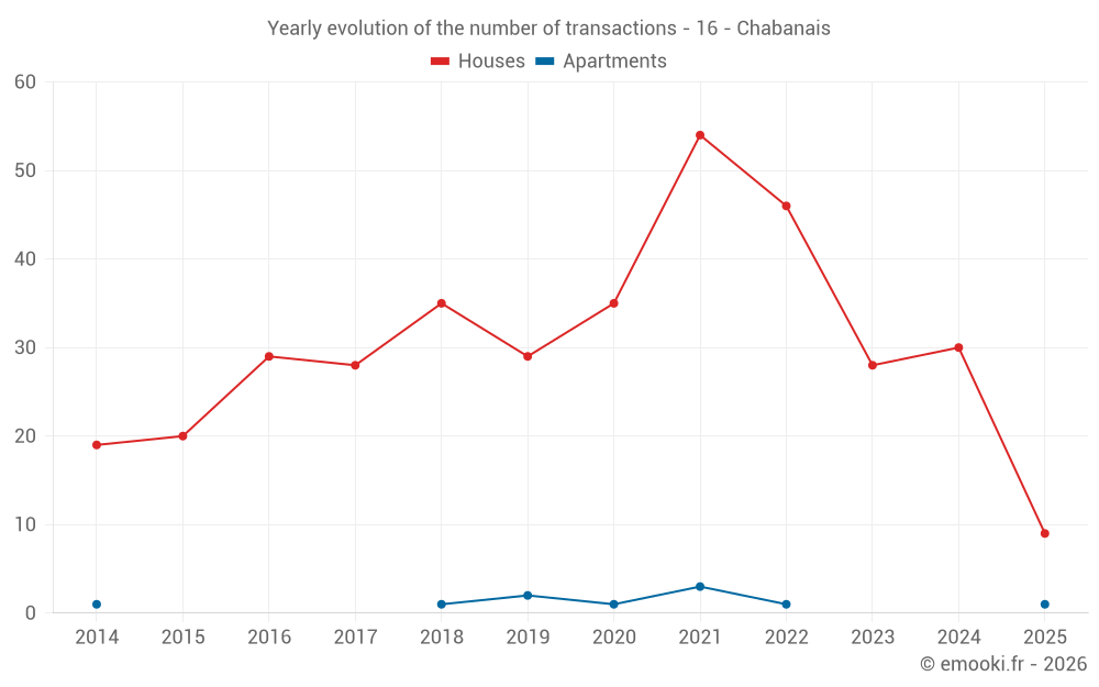 The median price on the 28 house transactions of the last 12 months in the municipality of Chabanais was 764 € per square meter for a median property value of 66 875 €. Over this period, 60% of transactions were between 573 and 1 381 € per square meter (from the 2nd to the 8th deciles).