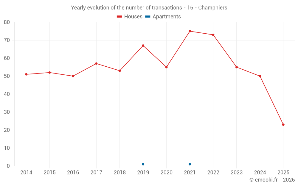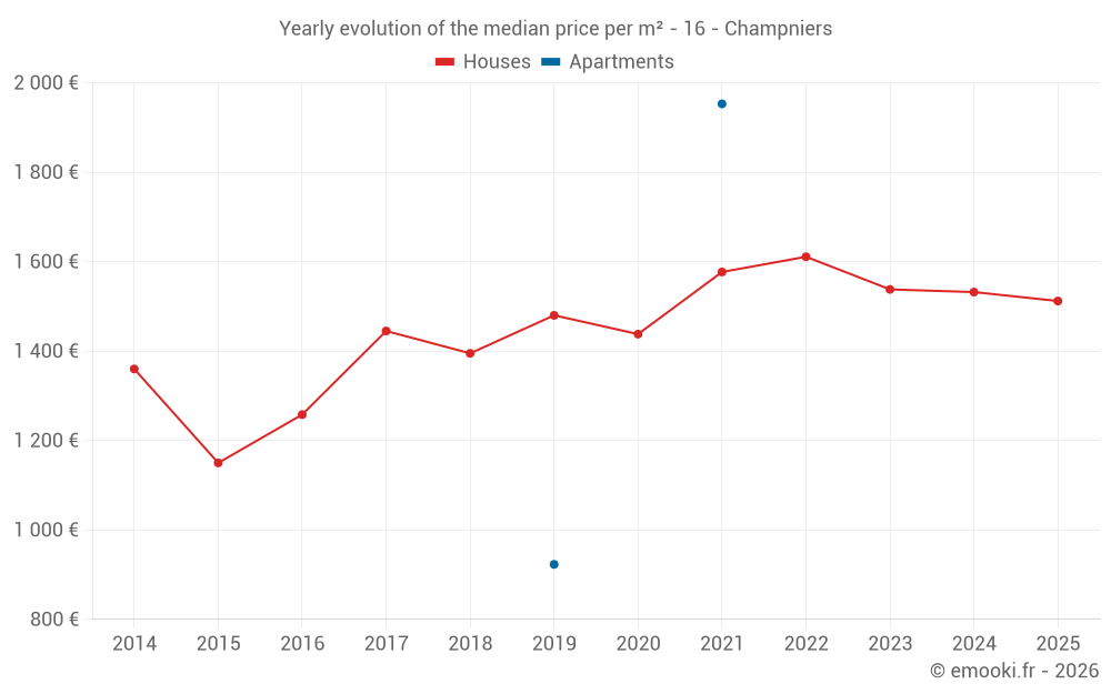 The median price on the 23 house transactions of the last 6 months in the municipality of Champniers was 1 512 € per square meter for a median property value of 165 000 €. Over this period, 60% of transactions were between 1 032 and 2 112 € per square meter (from the 2nd to the 8th deciles).
