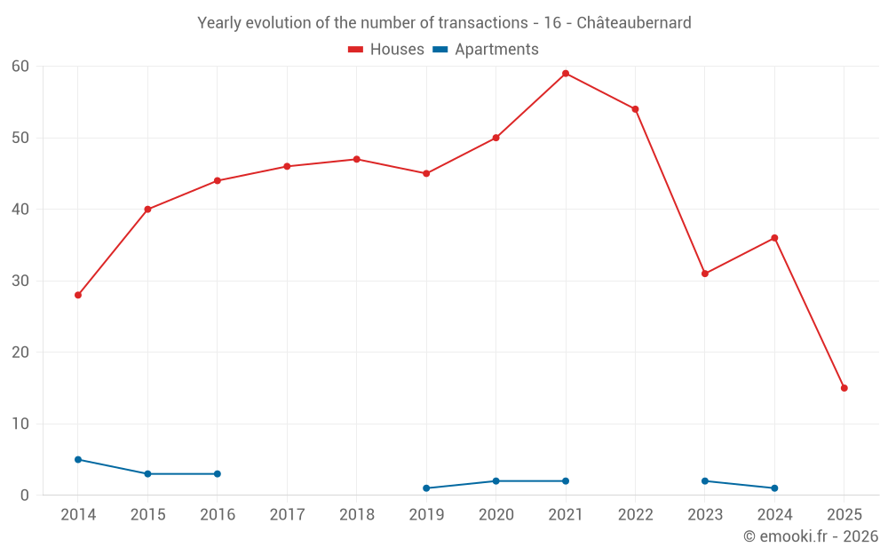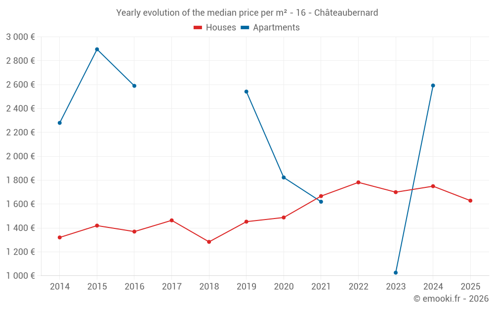 The median price on the 32 house transactions of the last 12 months in the municipality of Châteaubernard was 1 620 € per square meter for a median property value of 152 000 €. Over this period, 60% of transactions were between 1 352 and 1 962 € per square meter (from the 2nd to the 8th deciles).