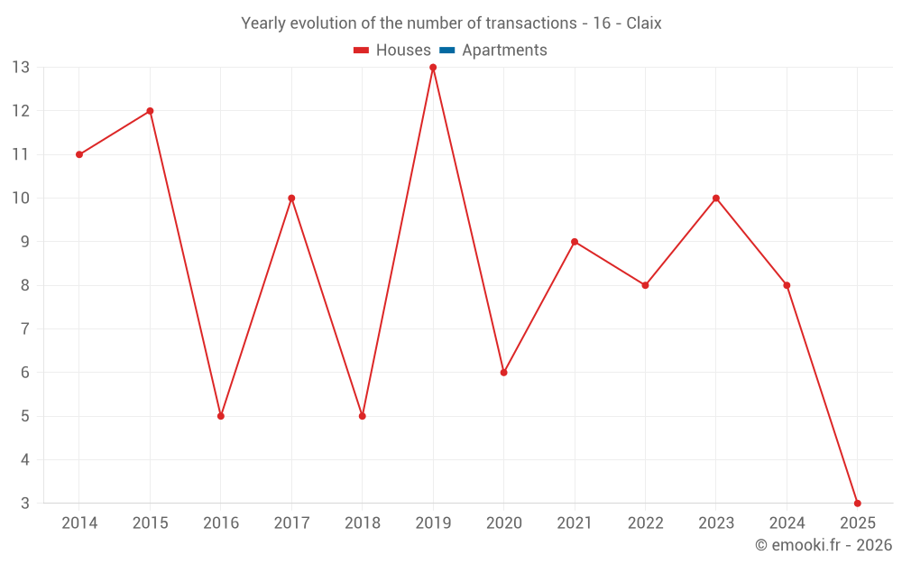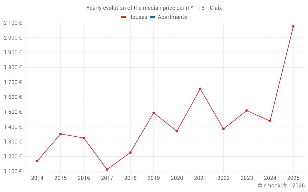 The median price on the 17 house transactions of the last 24 months in the municipality of Claix was 1 463 € per square meter for a median property value of 182 000 €. Over this period, 60% of transactions were between 1 163 and 2 030 € per square meter (from the 2nd to the 8th deciles).