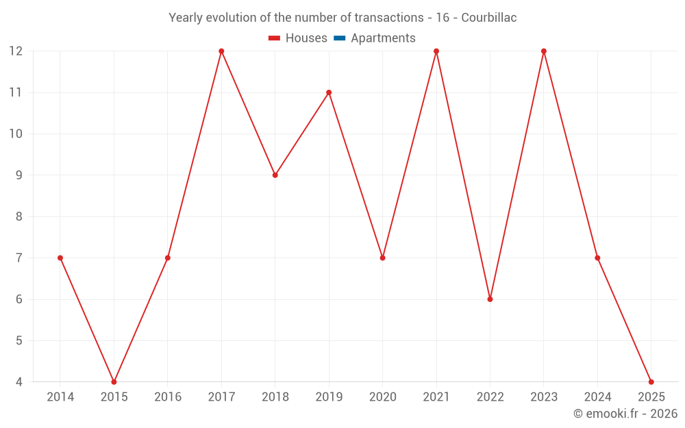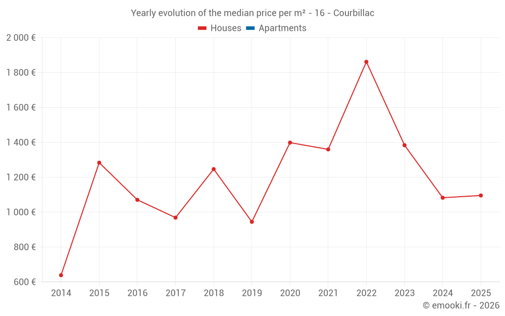 The median price on the 18 house transactions of the last 24 months in the municipality of Courbillac was 1 216 € per square meter for a median property value of 132 500 €. Over this period, 60% of transactions were between 922 and 1 859 € per square meter (from the 2nd to the 8th deciles).