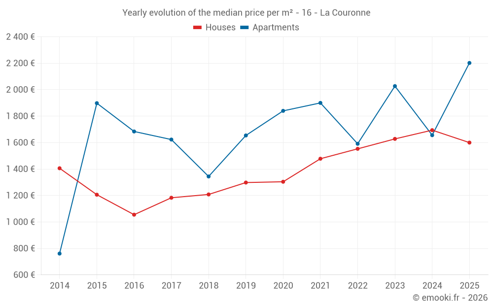 The median price on the 40 house transactions of the last 6 months in the municipality of La Couronne was 1 600 € per square meter for a median property value of 149 000 €. Over this period, 60% of transactions were between 1 159 and 2 041 € per square meter (from the 2nd to the 8th deciles).
