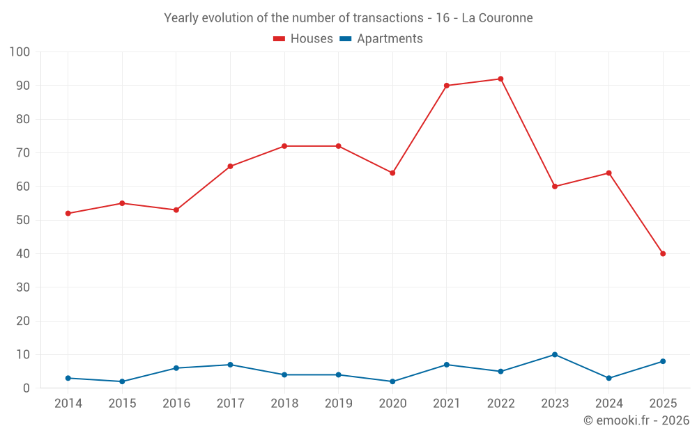 The median price on the 17 apartment transactions of the last 24 months in the municipality of La Couronne was 2 242 € per square meter for a median property value of 65 500 €. Over this period, 60% of transactions were between 1 659 and 2 561 € per square meter (from the 2nd to the 8th deciles).