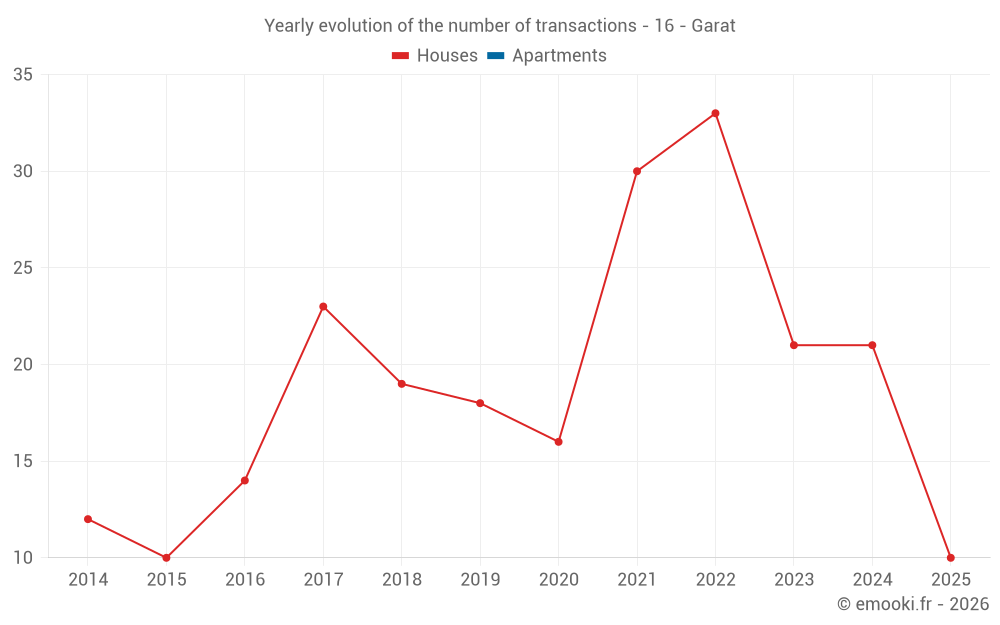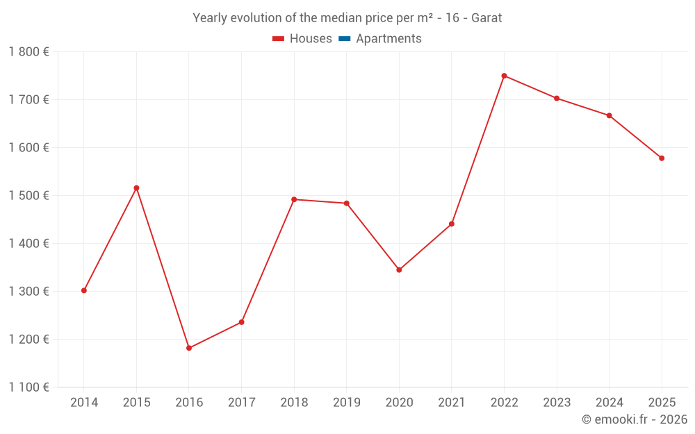 The median price on the 24 house transactions of the last 12 months in the municipality of Garat was 1 625 € per square meter for a median property value of 175 000 €. Over this period, 60% of transactions were between 928 and 2 073 € per square meter (from the 2nd to the 8th deciles).