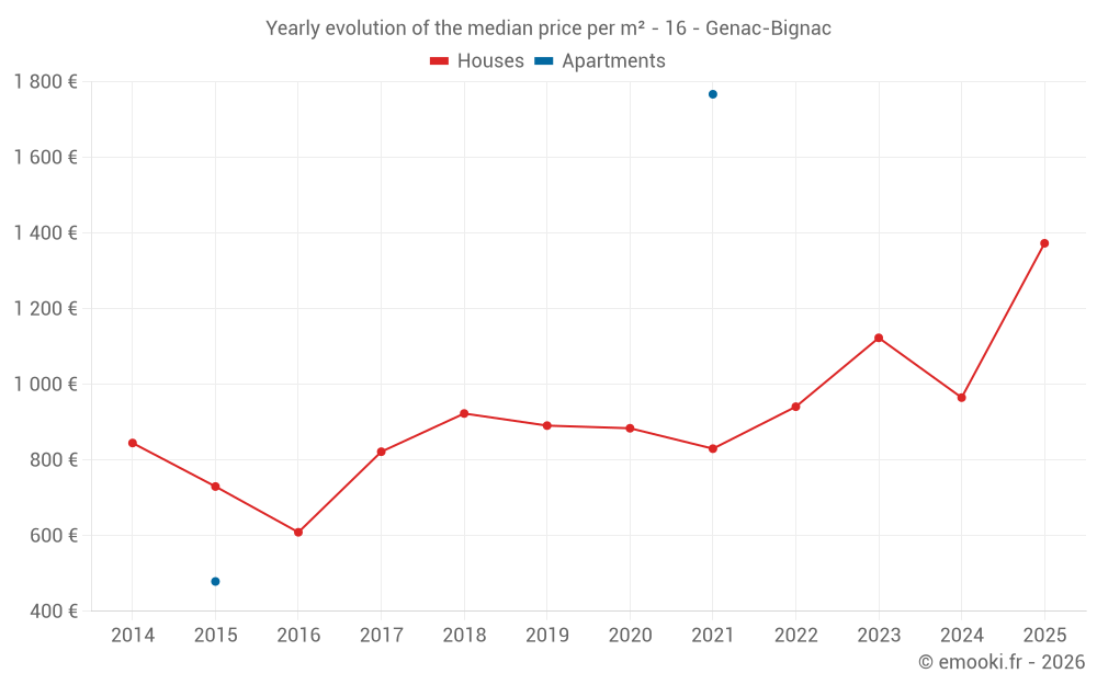 The median price on the 25 house transactions of the last 24 months in the municipality of Genac-Bignac was 1 082 € per square meter for a median property value of 125 000 €. Over this period, 60% of transactions were between 692 and 1 617 € per square meter (from the 2nd to the 8th deciles).