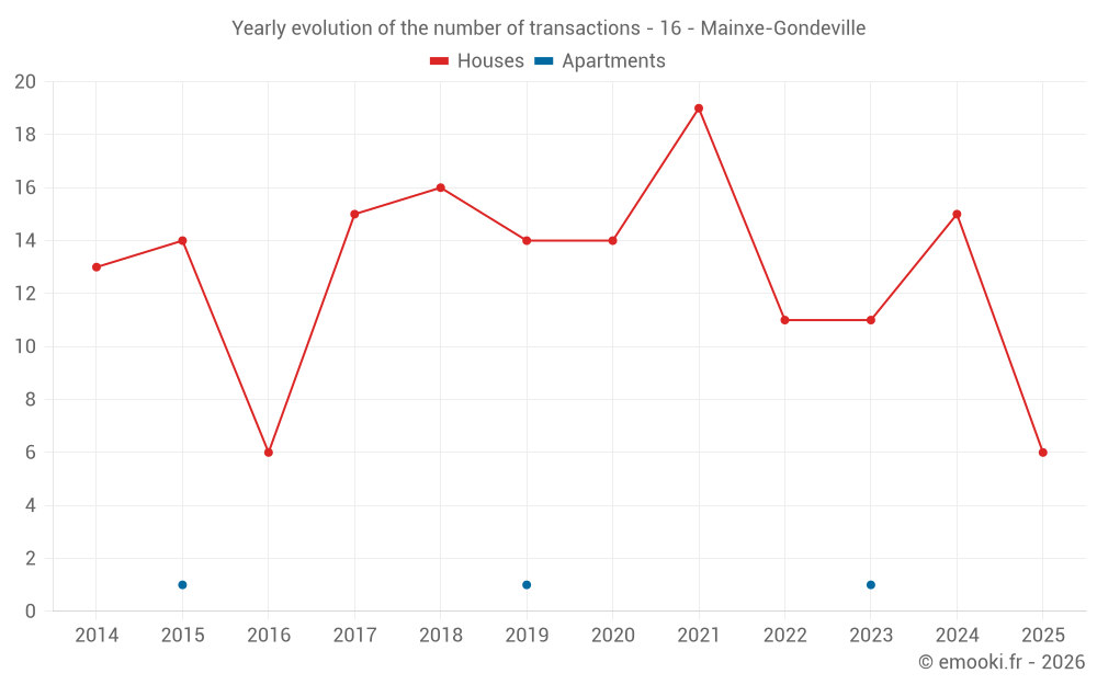 The median price on the 16 house transactions of the last 12 months in the municipality of Mainxe-Gondeville was 1 518 € per square meter for a median property value of 160 000 €. Over this period, 60% of transactions were between 857 and 1 786 € per square meter (from the 2nd to the 8th deciles).