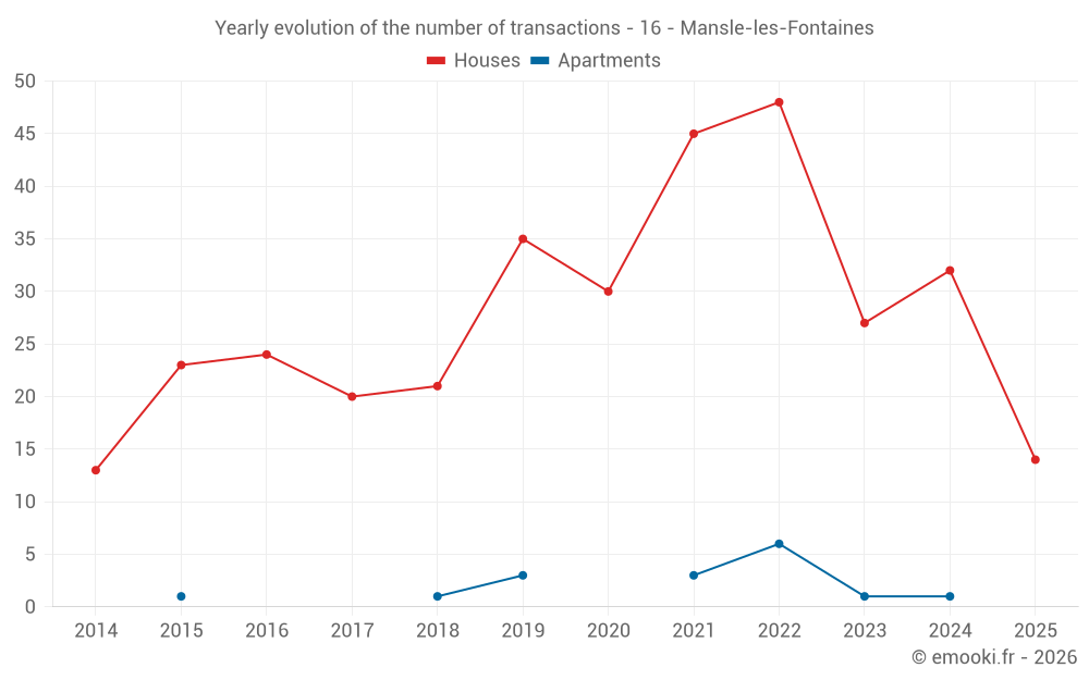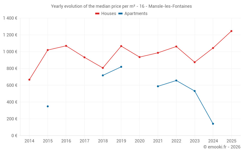 The median price on the 25 house transactions of the last 12 months in the municipality of Mansle-les-Fontaines was 1 190 € per square meter for a median property value of 115 000 €. Over this period, 60% of transactions were between 680 and 1 658 € per square meter (from the 2nd to the 8th deciles).