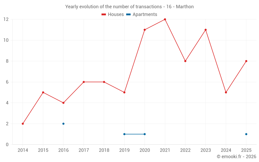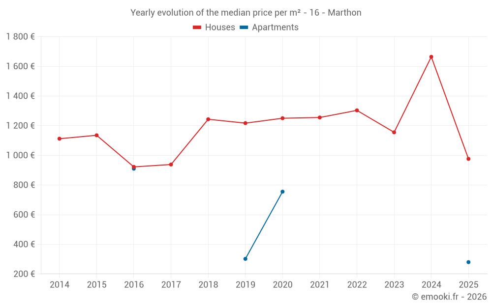 The median price on the 17 house transactions of the last 24 months in the municipality of Marthon was 1 066 € per square meter for a median property value of 119 340 €. Over this period, 60% of transactions were between 637 and 1 806 € per square meter (from the 2nd to the 8th deciles).
