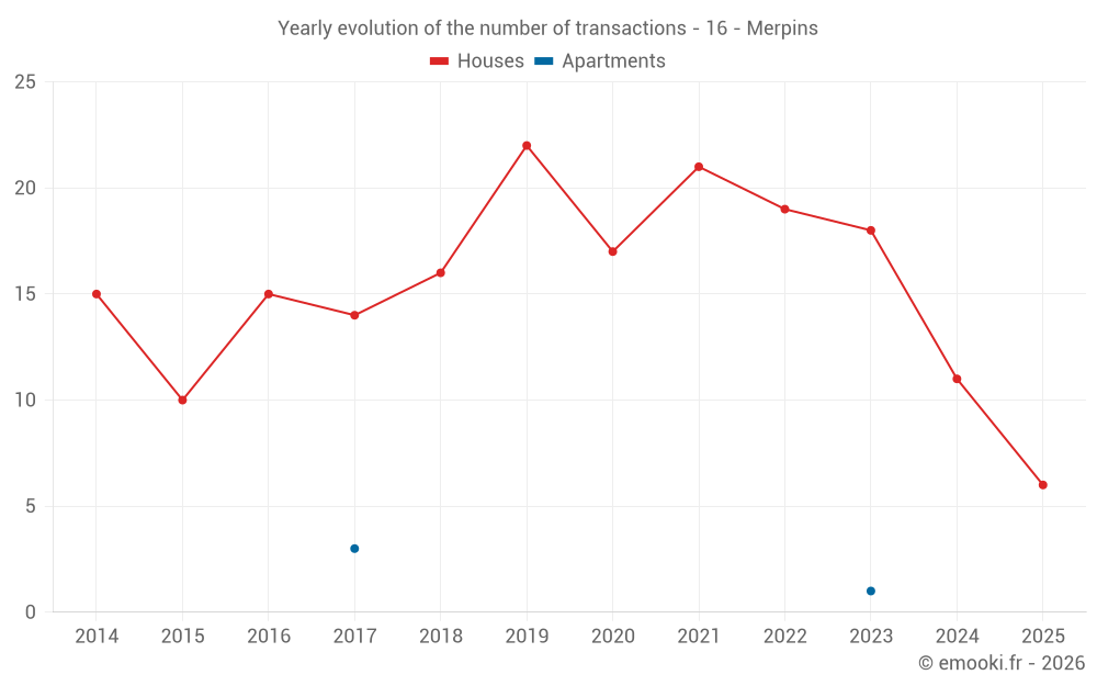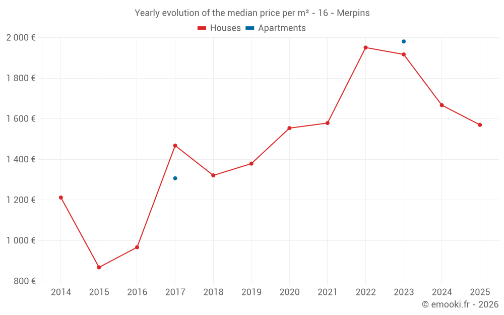 The median price on the 29 house transactions of the last 24 months in the municipality of Merpins was 1 778 € per square meter for a median property value of 169 000 €. Over this period, 60% of transactions were between 1 111 and 2 136 € per square meter (from the 2nd to the 8th deciles).