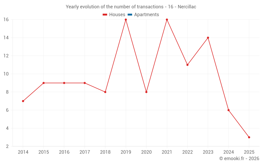 The median price on the 18 house transactions of the last 24 months in the municipality of Nercillac was 1 683 € per square meter for a median property value of 177 025 €. Over this period, 60% of transactions were between 1 026 and 2 284 € per square meter (from the 2nd to the 8th deciles).