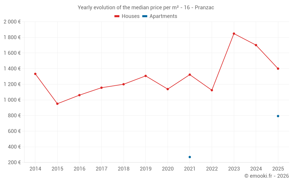 The median price on the 18 house transactions of the last 24 months in the municipality of Pranzac was 1 516 € per square meter for a median property value of 148 500 €. Over this period, 60% of transactions were between 824 and 1 967 € per square meter (from the 2nd to the 8th deciles).