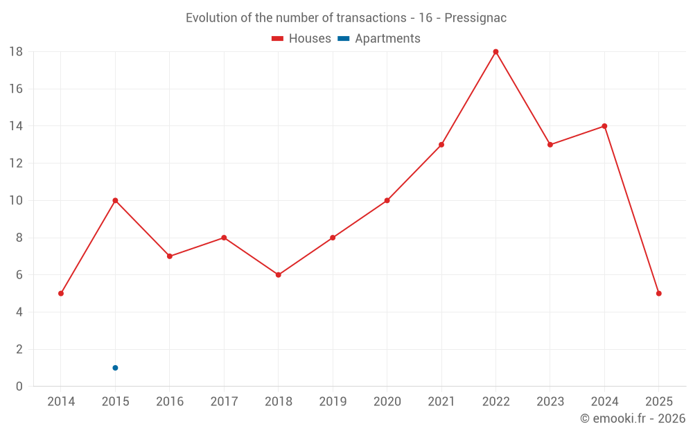 The median price on the 22 house transactions of the last 24 months in the municipality of Pressignac was 769 € per square meter for a median property value of 92 450 €. Over this period, 60% of transactions were between 530 and 1 158 € per square meter (from the 2nd to the 8th deciles).