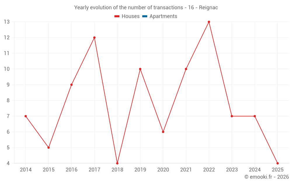 The median price on the 14 house transactions of the last 24 months in the municipality of Reignac was 990 € per square meter for a median property value of 91 110 €. Over this period, 60% of transactions were between 398 and 1 581 € per square meter (from the 2nd to the 8th deciles).