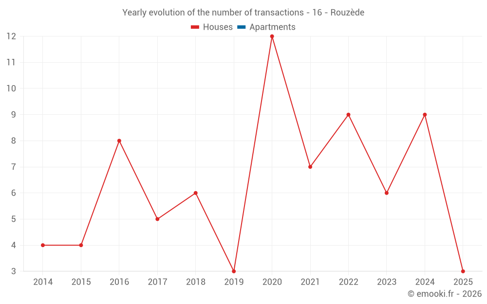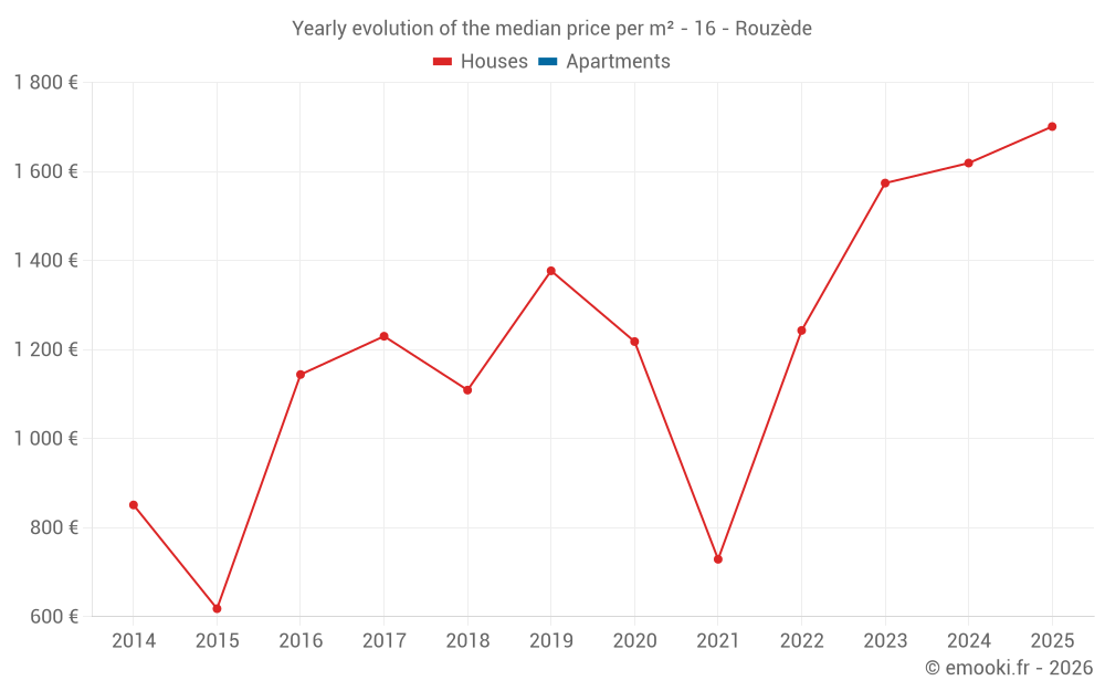 The median price on the 17 house transactions of the last 24 months in the municipality of Rouzède was 1 619 € per square meter for a median property value of 244 500 €. Over this period, 60% of transactions were between 1 060 and 2 121 € per square meter (from the 2nd to the 8th deciles).