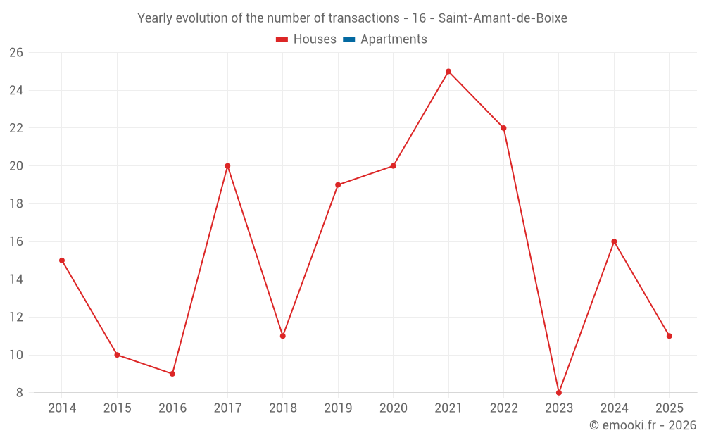 The median price on the 20 house transactions of the last 12 months in the municipality of Saint-Amant-de-Boixe was 1 060 € per square meter for a median property value of 100 000 €. Over this period, 60% of transactions were between 561 and 1 498 € per square meter (from the 2nd to the 8th deciles).