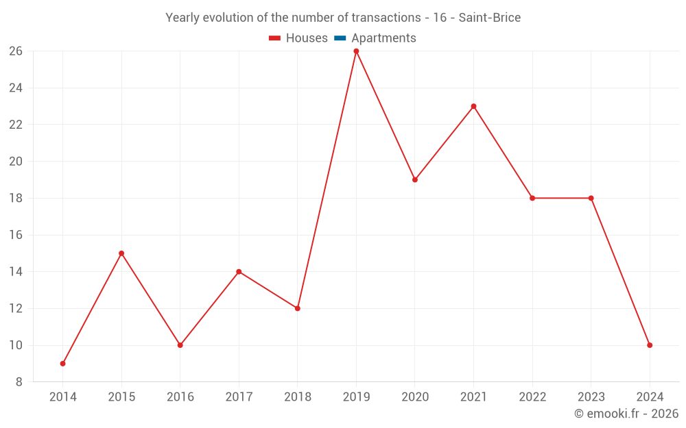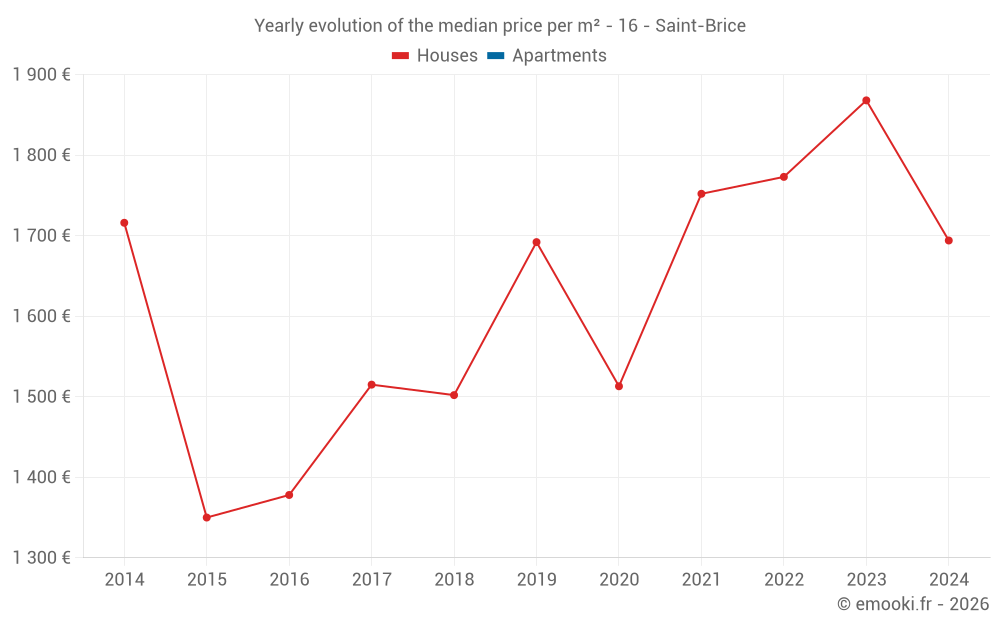 The median price on the 22 house transactions of the last 24 months in the municipality of Saint-Brice was 1 779 € per square meter for a median property value of 210 190 €. Over this period, 60% of transactions were between 1 099 and 2 386 € per square meter (from the 2nd to the 8th deciles).