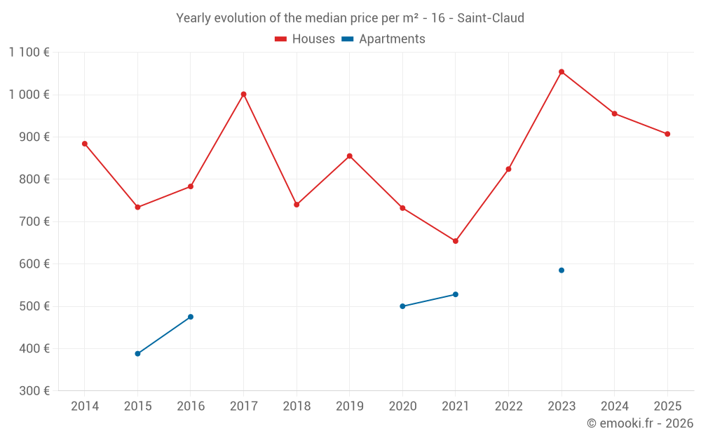 The median price on the 30 house transactions of the last 24 months in the municipality of Saint-Claud was 1 052 € per square meter for a median property value of 97 988 €. Over this period, 60% of transactions were between 820 and 1 335 € per square meter (from the 2nd to the 8th deciles).