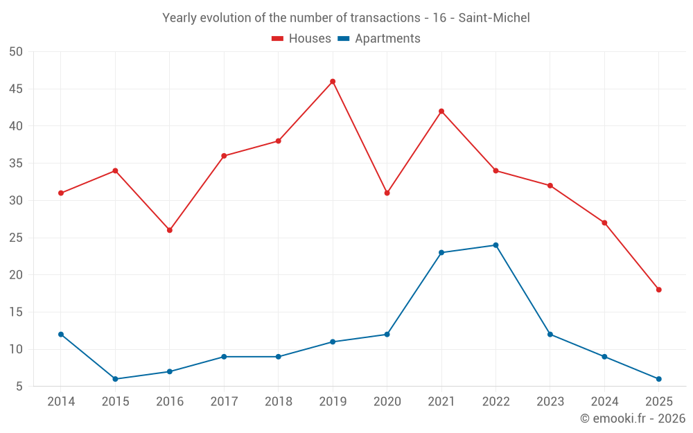The median price on the 20 apartment transactions of the last 24 months in the municipality of Saint-Michel was 1 747 € per square meter for a median property value of 91 250 €. Over this period, 60% of transactions were between 1 614 and 2 000 € per square meter (from the 2nd to the 8th deciles).