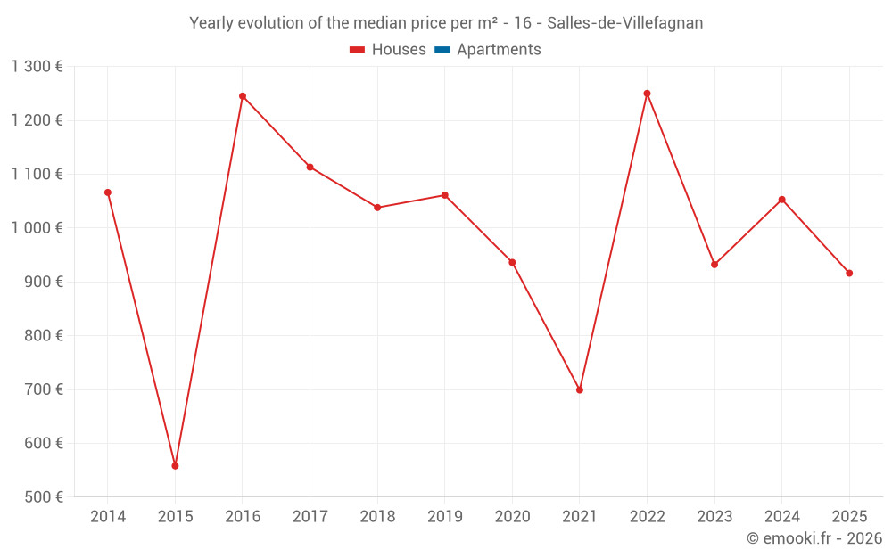 The median price on the 17 house transactions of the last 24 months in the municipality of Salles-de-Villefagnan was 933 € per square meter for a median property value of 106 000 €. Over this period, 60% of transactions were between 648 and 1 362 € per square meter (from the 2nd to the 8th deciles).