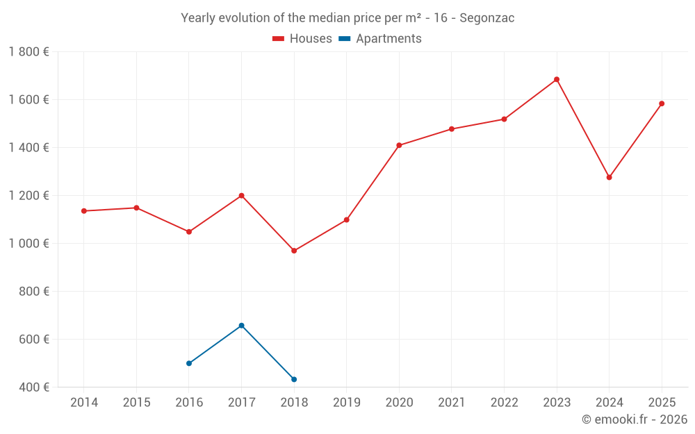 The median price on the 26 house transactions of the last 12 months in the municipality of Segonzac was 1 620 € per square meter for a median property value of 155 300 €. Over this period, 60% of transactions were between 958 and 1 946 € per square meter (from the 2nd to the 8th deciles).